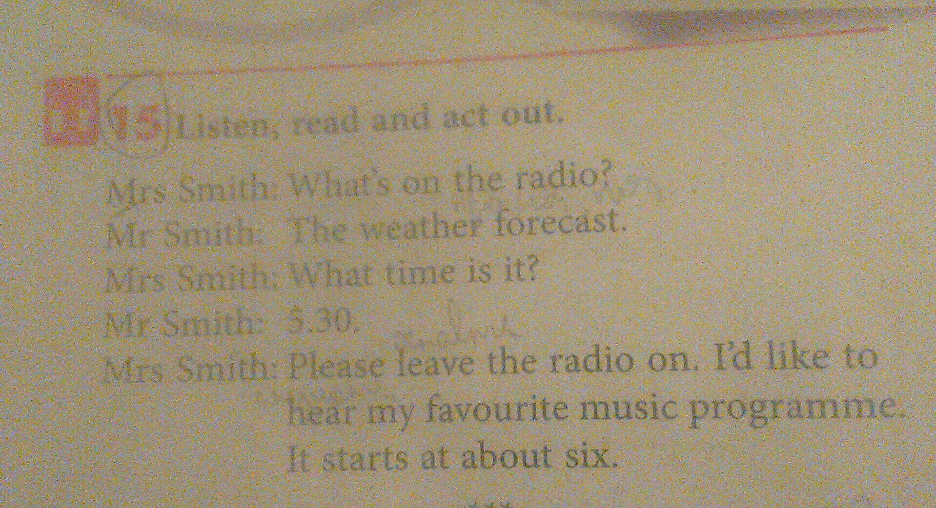 Мистер Смит: Пожалуйста, оставьте радио включенным. Я хотел бы услышать мою любимую музыкальную программу. Начинается примерно с шести.