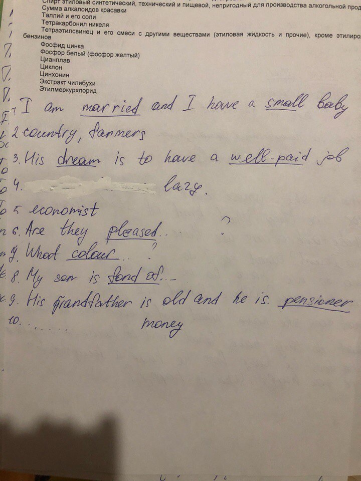 VI. Дополните предложения словами из предложенного списка: married, farmers, lazy, economist, baby, dream, well-paid, country, pleased, colour, fond of, pensioner, money