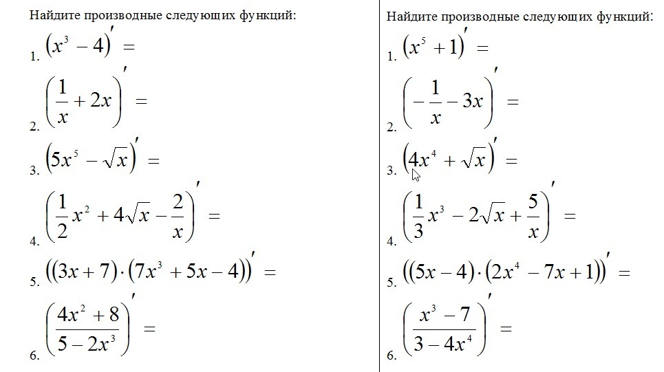 6)![(frac{x^3-7}{3-4x^4})'= frac{3x^2(3-4x^4)-(-16x^3)(x^3-7)}{(3-4x^4)^2}= frac{9x^2-12x^6+16x^6-112x^3}{(3-4x^4)^2}=[tex] frac{4x^6-112x^3+9x^2}{(3-4x^4)^2} (frac{x^3-7}{3-4x^4})'= frac{3x^2(3-4x^4)-(-16x^3)(x^3-7)}{(3-4x^4)^2}= frac{9x^2-12x^6+16x^6-112x^3}{(3-4x^4)^2}=[tex] frac{4x^6-112x^3+9x^2}{(3-4x^4)^2}](https://tex.z-dn.net/?f=+%28frac%7Bx%5E3-7%7D%7B3-4x%5E4%7D%29%27%3D+frac%7B3x%5E2%283-4x%5E4%29-%28-16x%5E3%29%28x%5E3-7%29%7D%7B%283-4x%5E4%29%5E2%7D%3D++frac%7B9x%5E2-12x%5E6%2B16x%5E6-112x%5E3%7D%7B%283-4x%5E4%29%5E2%7D%3D%5Btex%5D+frac%7B4x%5E6-112x%5E3%2B9x%5E2%7D%7B%283-4x%5E4%29%5E2%7D++++)