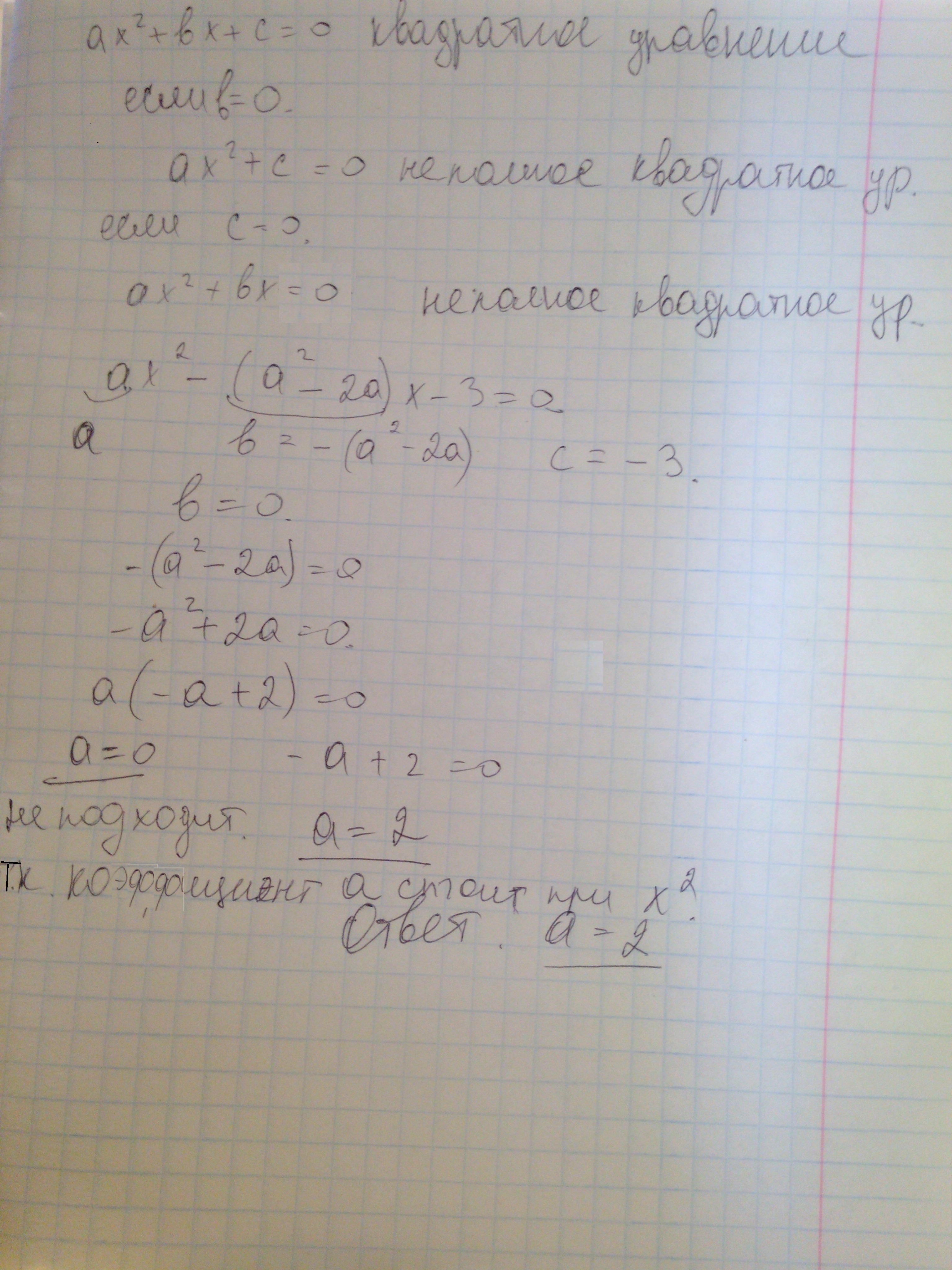 45б СРОЧНО При каком значении параметра а уравнение является неполным квадратным? ах^2-(а^2-2а) х-3=0 Объясните пж