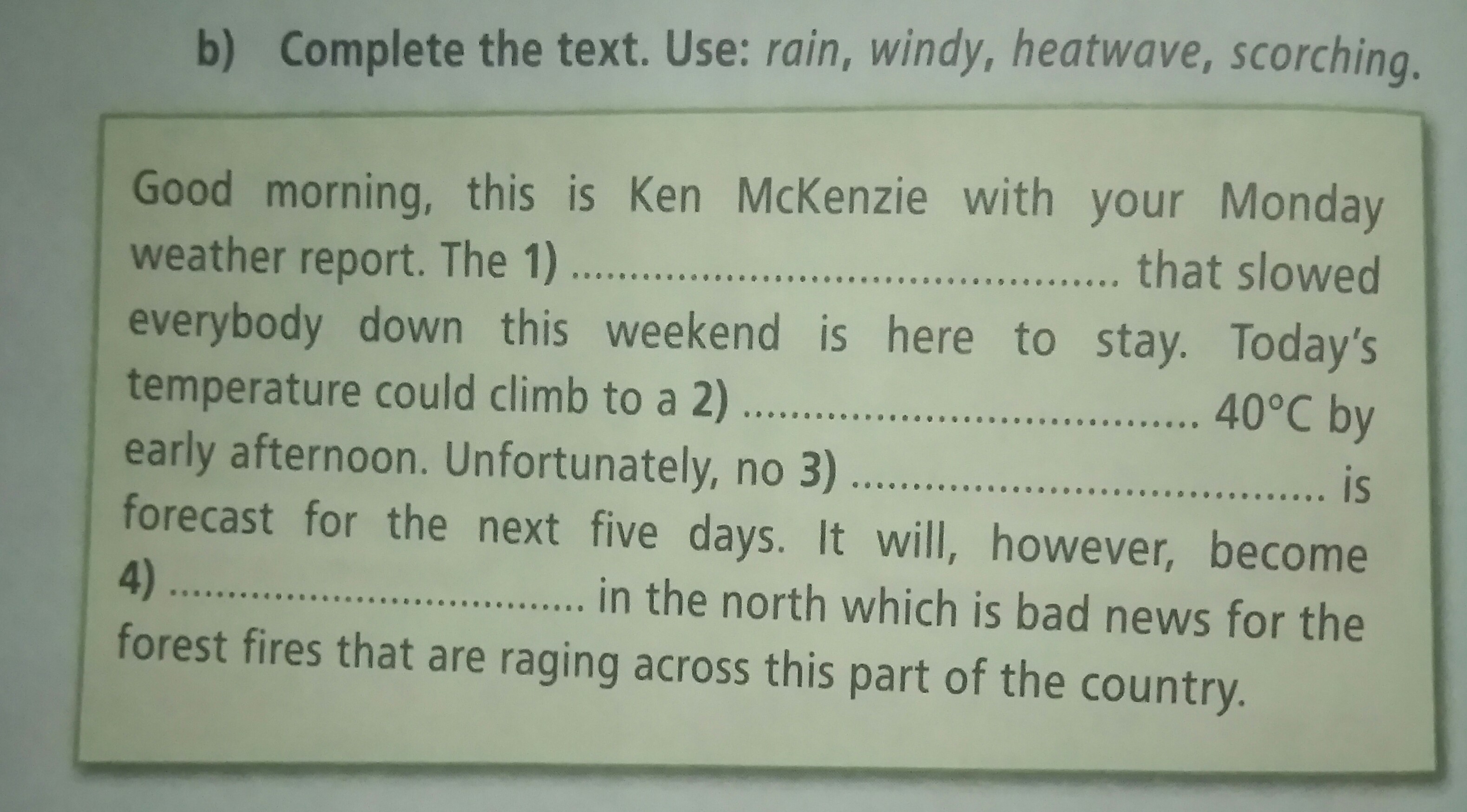 Good morning, this is Ken McKenzie with your Monday weather report. The 1 ) heatwave that slowed everybody down this weekend is here to stay. Today's temperature could climb to a 2) scorching 40°C by early afternoon. Unfortunately, no 3 ) rain is forecast for the next five days. It will, however, become 4 ) windy in the north which is bad news for the forest fires that are raging across this part of the country.