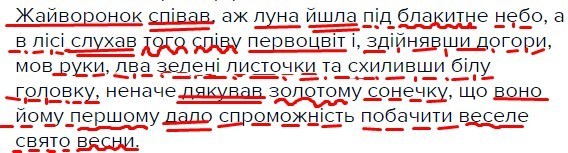 Жайворонок співав, аж луна йшла під блакитне небо, а в лісі слухав того співу первоцвіт і, здійнявши догори, мов руки, два зелені листочки та схиливши білу головку, неначе дякував золотому сонечку, що воно йому першому дало спроможність побачити веселе свято весни.