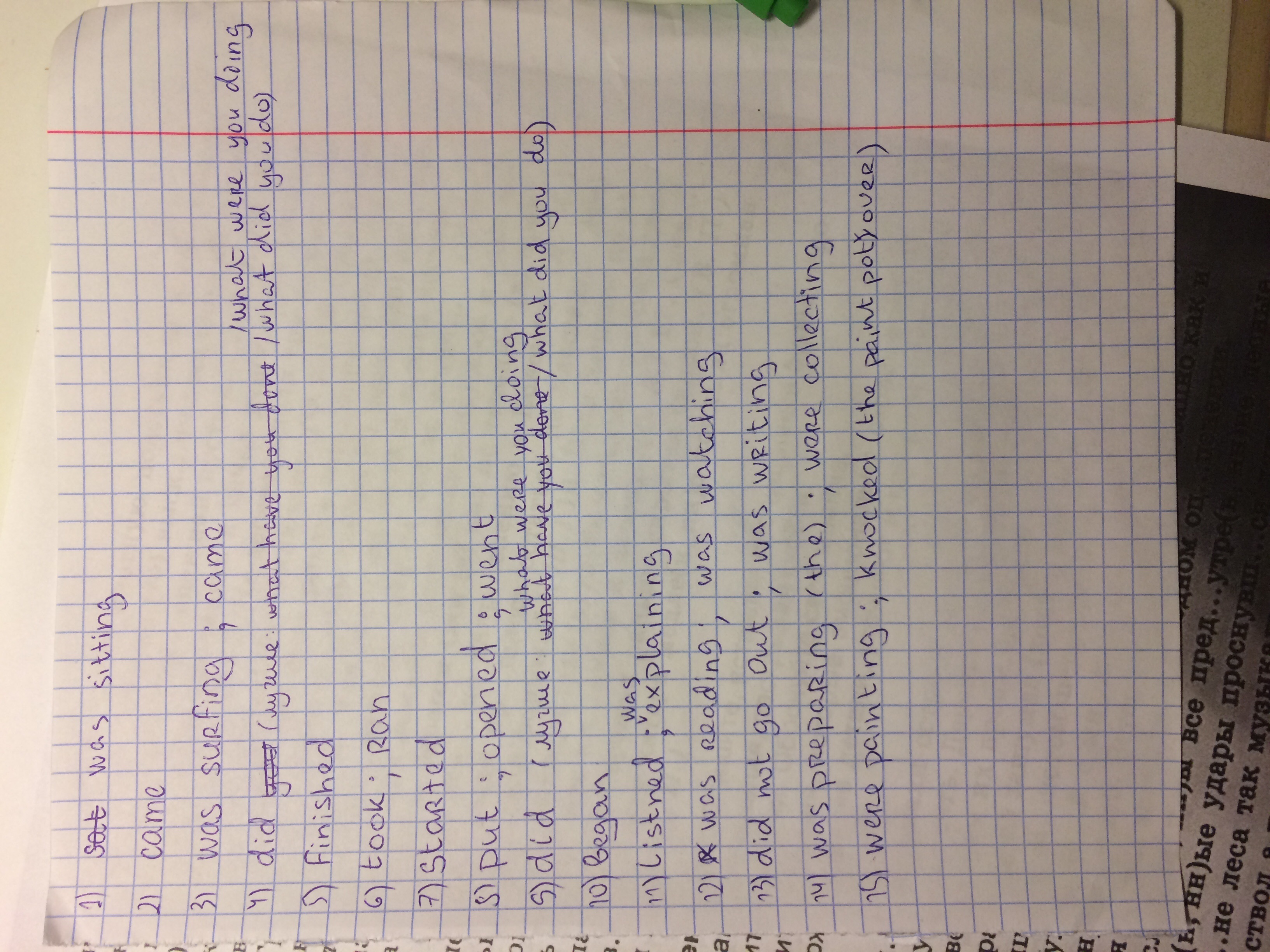 1) At this time yesterday I (sit) at the lecture. 2) He (come) back to St. Petersburg on the 15th of January. 3) He (to surf) a net when I (to come) in. 4) What you (do) at six o'clock yesterday? 5) Yesterday the classes (finish) at 5 o'clock. 6) The cat (take) a piece of fish and (run) away. 7) The train (start) at fifteen minutes to ten. 8) He (put) on his coat and cap, (open) the door and (go) out. 9) What you (do) at four o'clock yesterday? 10) I (begin) re-pairing my camera at six o'clock yesterday. 11) Nobody (listen) while the teacher (explain) the theme. 12) While Tom (read), Amely (watch) a film on TV. 13) Kate (not go) out yesterday. She (write) a term-paper the whole day yesterday. 14) As long as one group (prepare) dinner, the others (collect) wood for their campfire. 15) When Mike and Jane (paint) the walls, their dog (knock) over the paint pot.