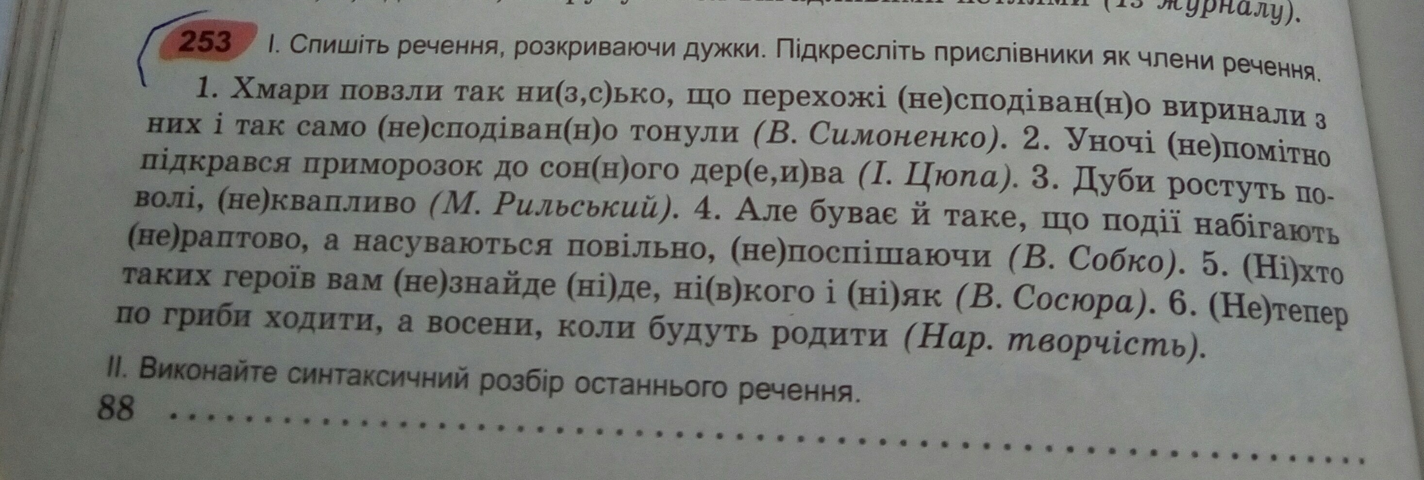 Хмари повзли так низько, що перехожі несподівано виринали з них і так само несподівано тонули. 2. Уночі не помітно підкрався приморозок до сонного дерева. 3. Дуби ростуть поволі, не квапливо. 4.Але бува й таке, що події набігають не раптово, а насуваються повільно, не поспішаючи. 5. Ніхто таких героїв вам не знайде ніде, ні в кого і ніяк. 6.Не тепер по гриби ходити, а восени, коли будуть родити.