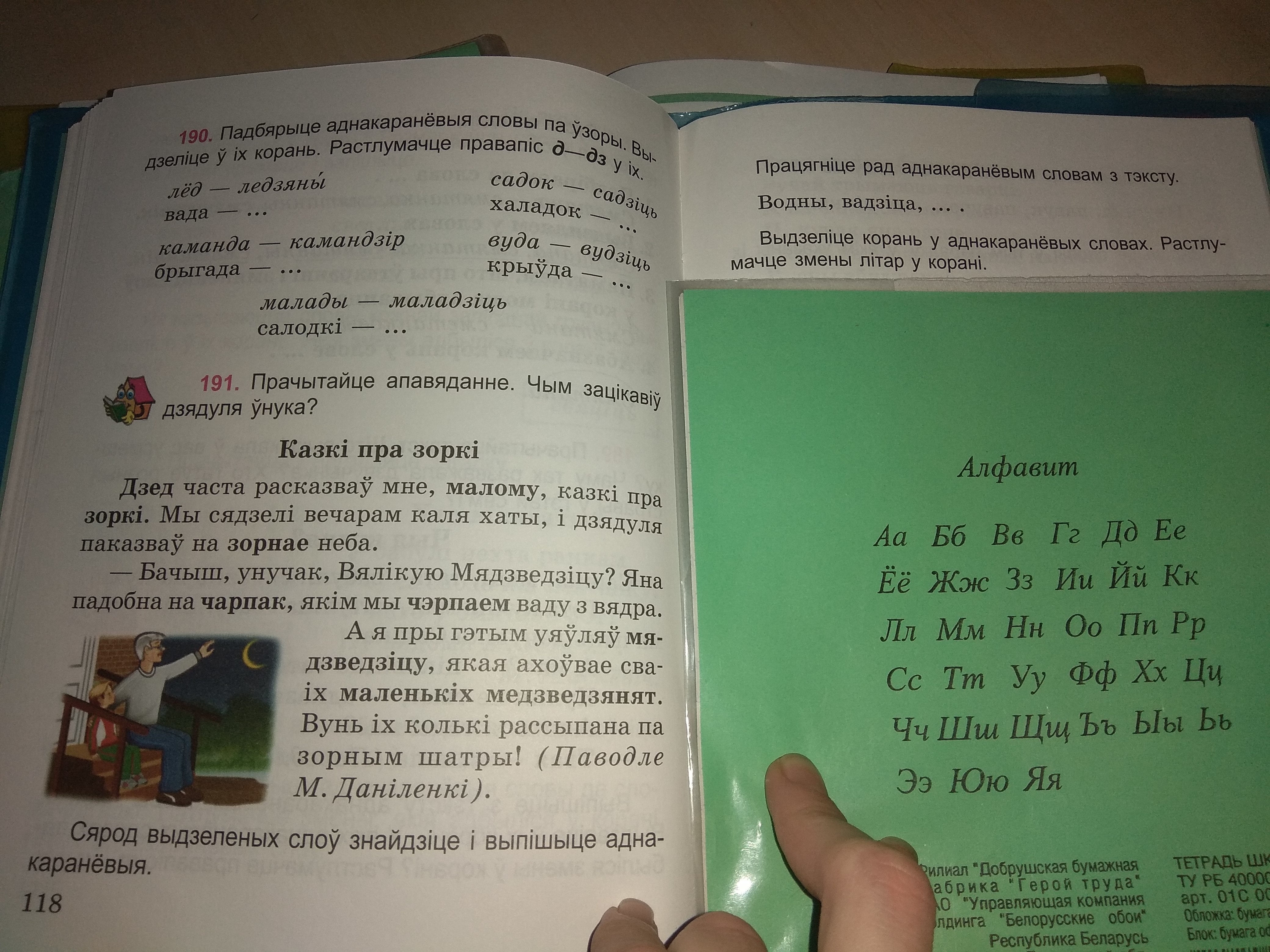 Аднакаранёвыя словы: Зор-кі, зор-нае; мал-ому, мал-енькіх; чарп-ак, чэрп-аем (чаргаванне, таму што змяняецца націск); мядзведз-іцу, мядзведз-янят.