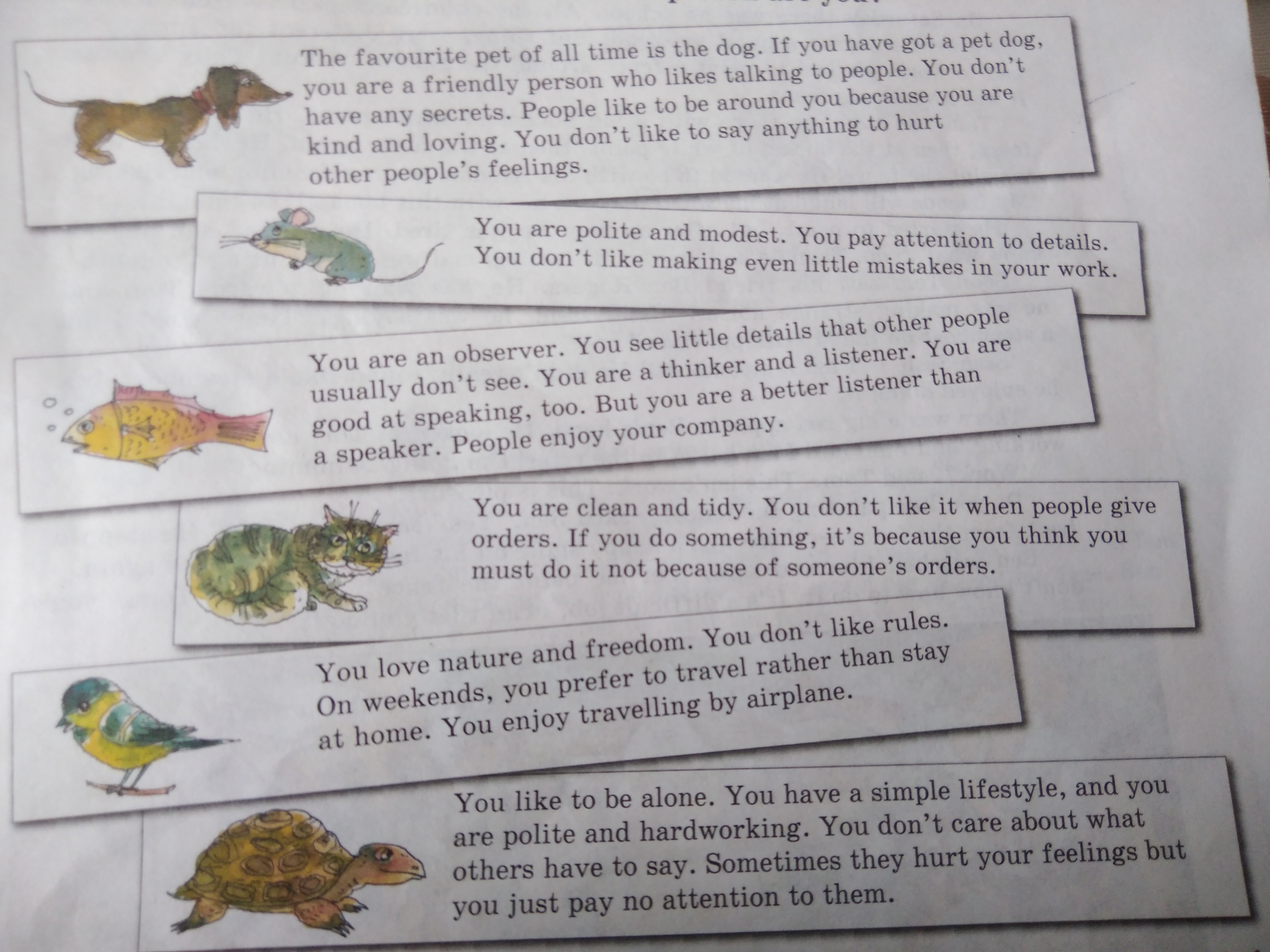 Любимейший питомец во все времена - собака. Если твой питомец собака, то ты - дружелюбный человек, который любит разговаривать с людьми. тебя нет от них секретов. Люди любят крутиться вокруг тебя, потому что ты добрый и любящий. Ты считаешь неправильным говорить то, что может поранить чувства других людей.