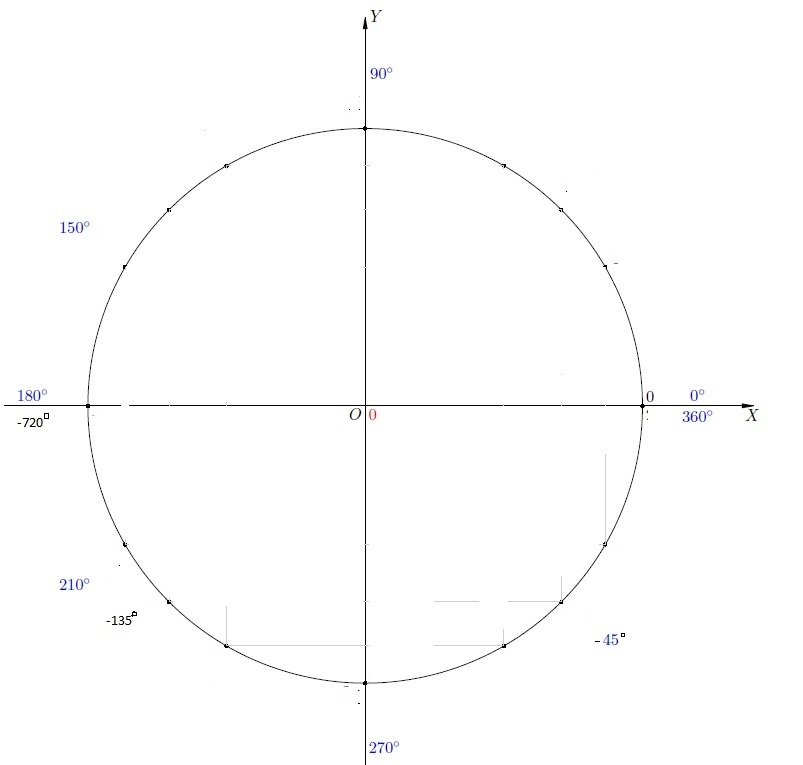 С помощью тригонометрического круга изобразите углы, градусной меры которых равны:150°,210°,540°,- 45°,-135°,-720°.