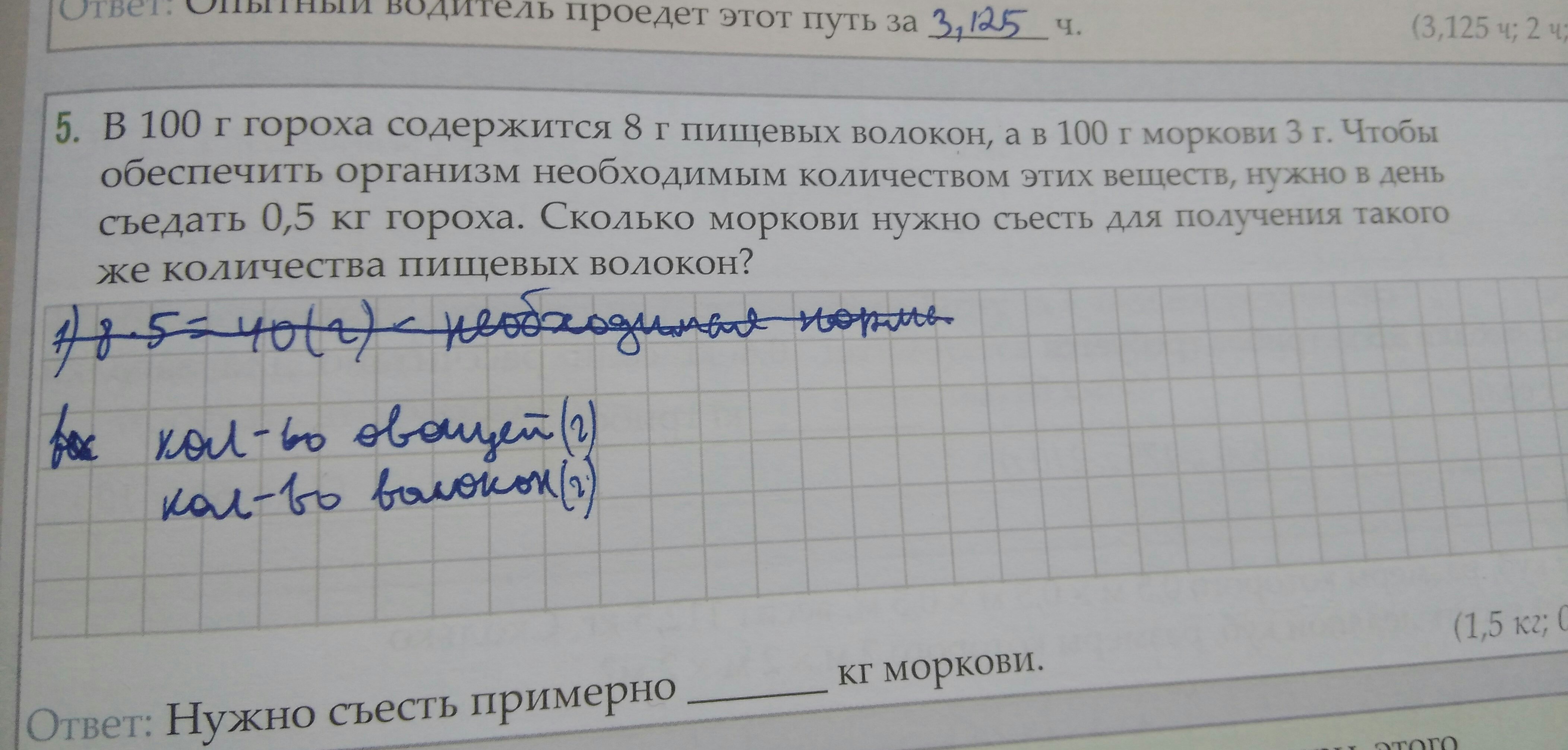 В 100г гороха содержится 8г пищевых волокон, а в 100г моркови-3г. Чтобы обеспечить организм необходимым количеством волокон, нужно сьесть 0.5 кг гороха. Сколько нужно сьесть моркови для получения этой же нормы? Начерти таблицу пропорций и реши задачу.