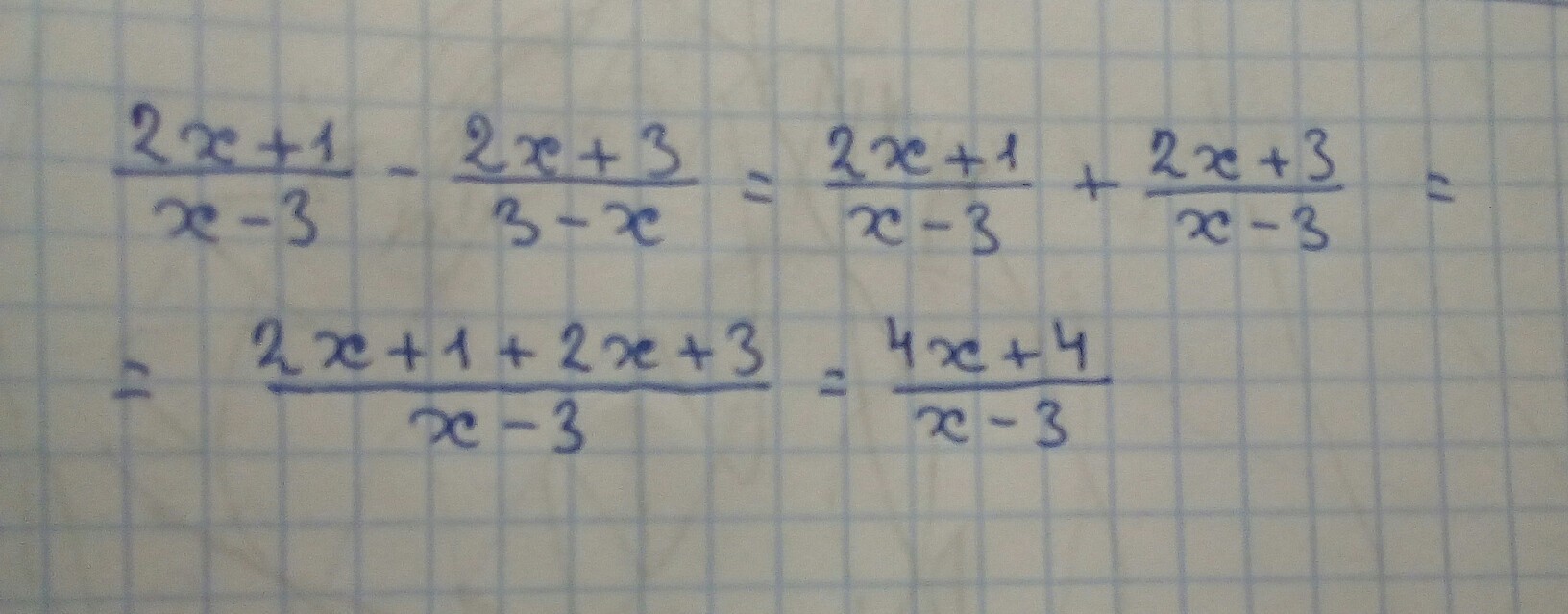 2x+1/x-3 + 2x+3/(x-3) (мы из второго знаменателя вынесли минус)