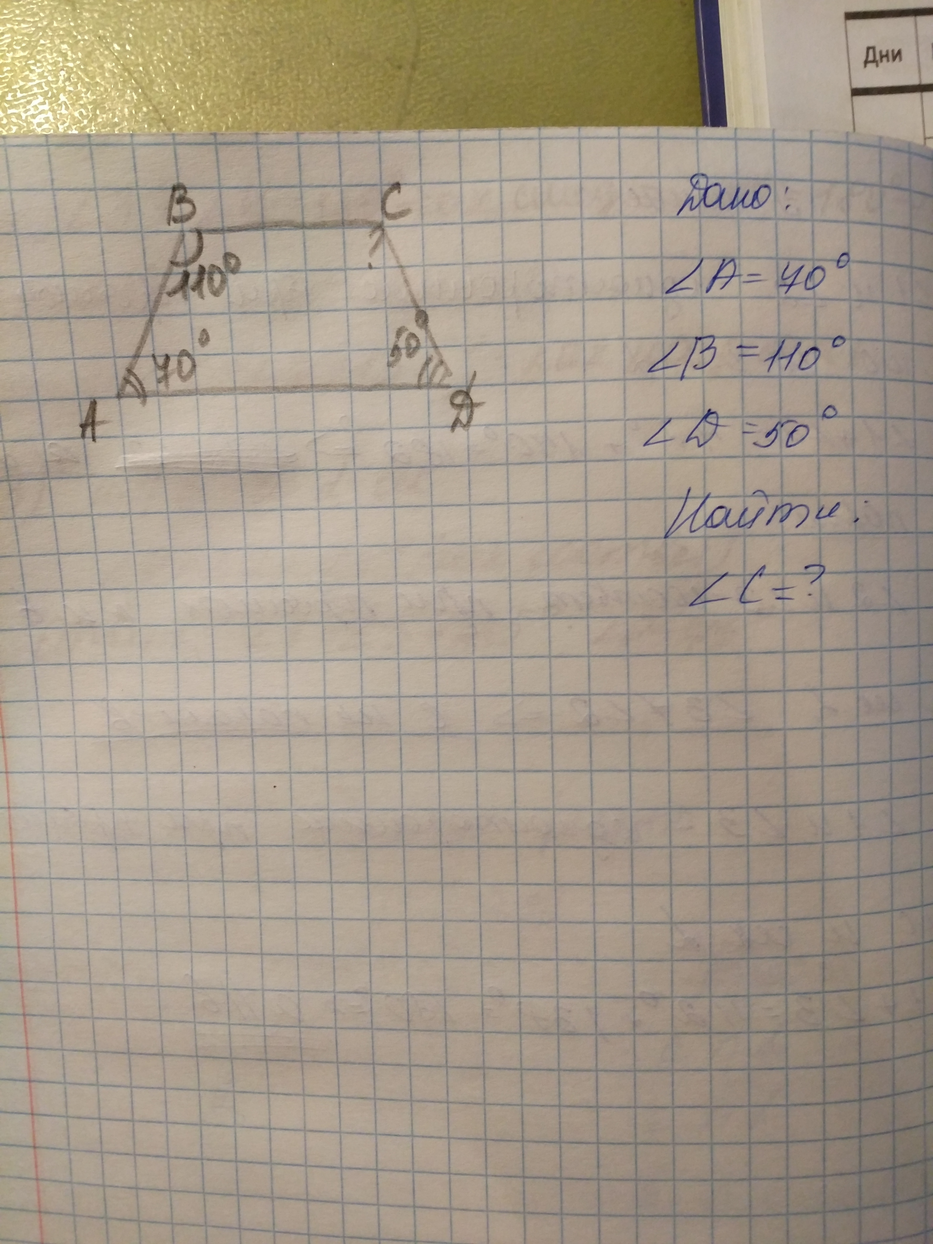 Сумма углов любого четырехугольника(в том числе и трапеции) 360°, поэтому /_C = 360° - /_A - /_В - /_D = 360° - 110° - 70° - 50° = 130°