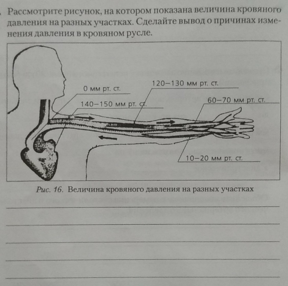 Рассмотрите рисунок на котором показана величина кровяного давления на разных участках. Сделайте вывод о причинах изменения давления в кровяном русле.
