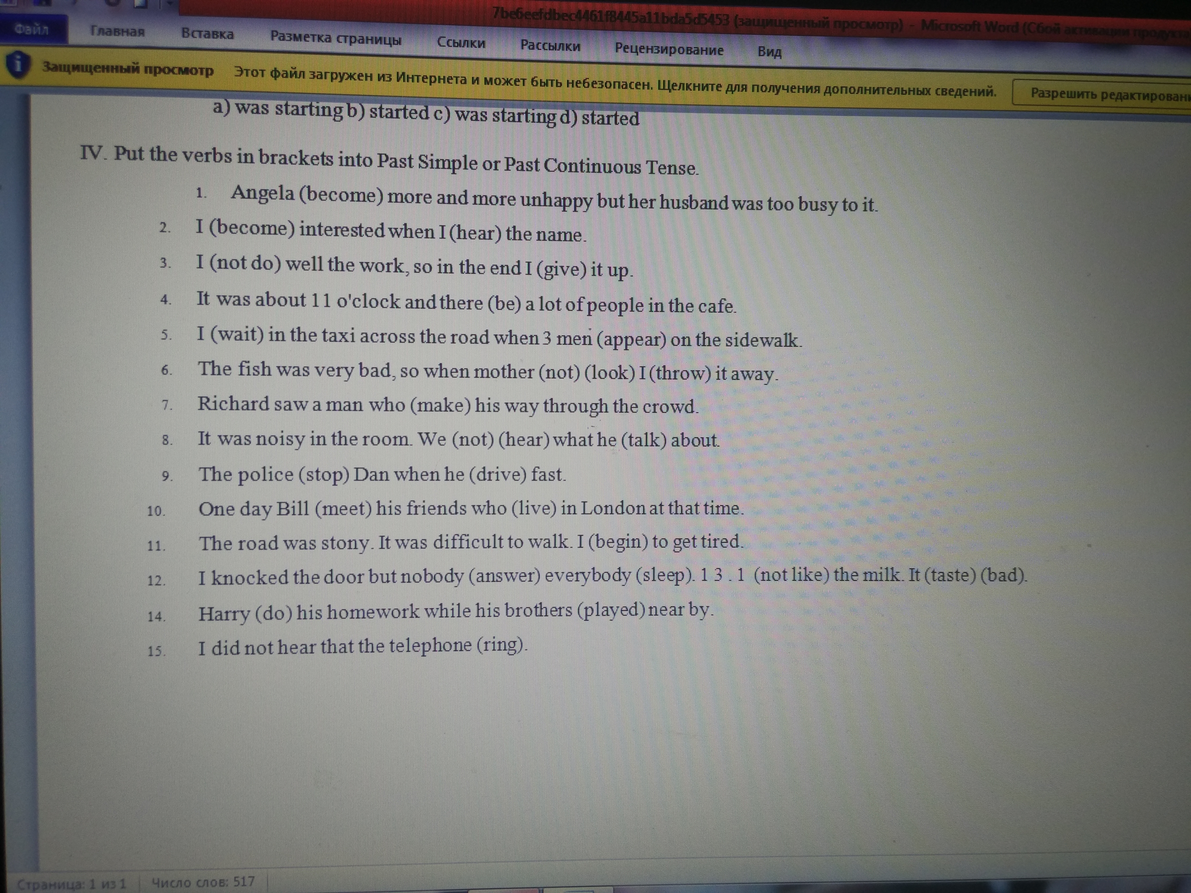 5.was waiting ...appeared 7.was making 8.did not heart...talked 9.stoped ...was driving 10.met ...were living 11. began 12. did not answered ...were sleeping 14. did ...were playing 15-was ringing