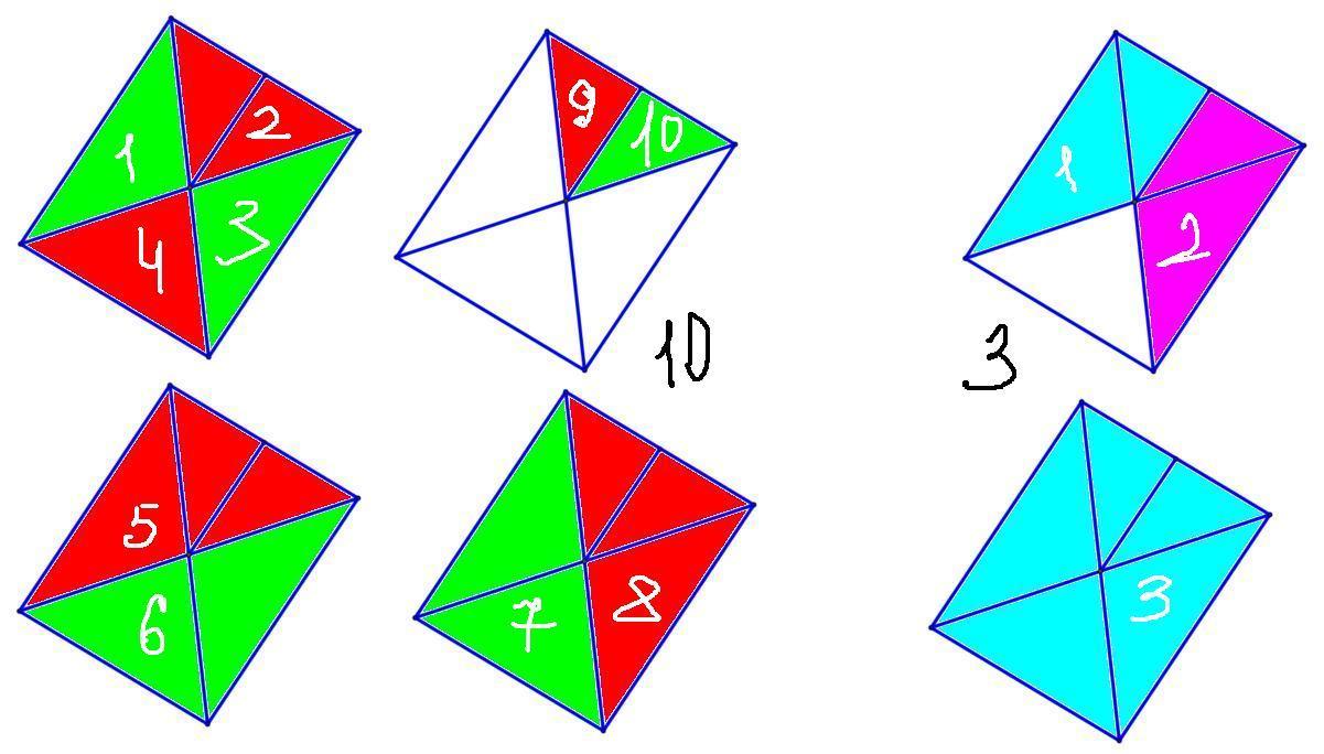 РЕШЕНИЕ: Треугольников: 10. Четырёхугольников: 3. Треугольников больше на 7