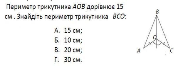 Ответ А(15 см), т.к. АО=ОС, а угол АОС делен пополам, то соответственно АВ=ВС и следовательно периметр АОВ равен периметру ВОС