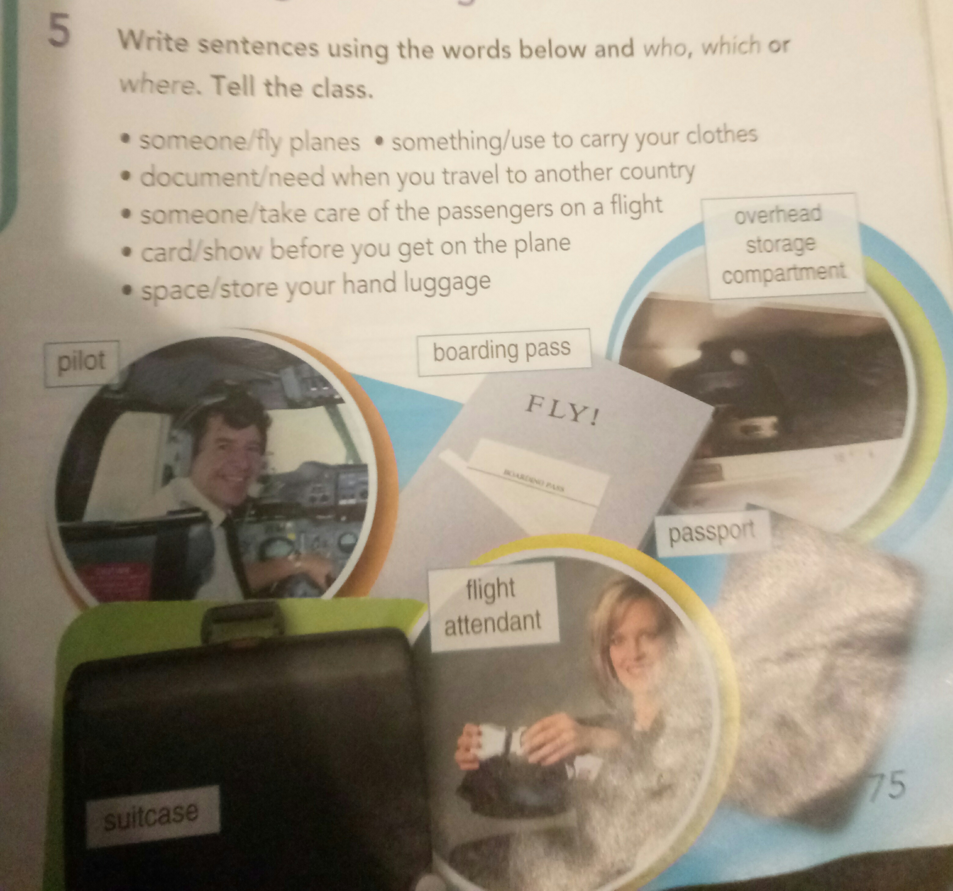 1.Pilot. 2. suitcase. 3.passport. 4.flight attendant. 5. boarding pass. 6.overhead storage compartment.