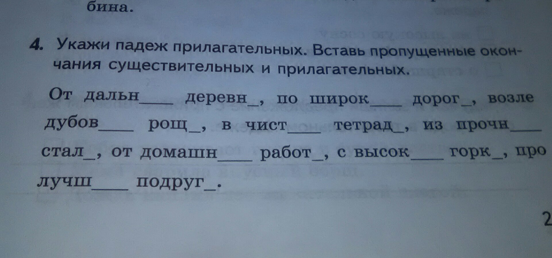 Укажи падеж прилагательных. Вставь пропущенные окончания существительных и прилагательных.