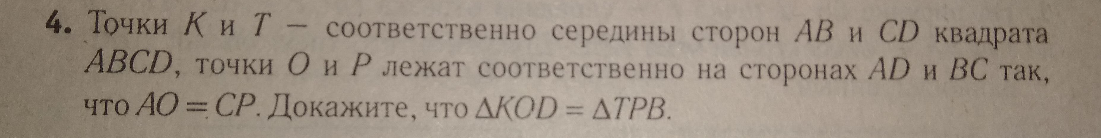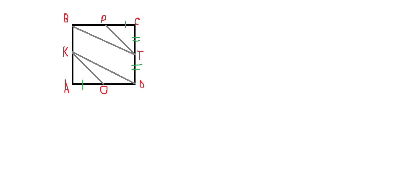 Точки K и T соответственно середины сторон AB и CD квадрата ABCD точки O и P лежат соответственно сторонах AD и BC так что AO=CP Докажите что треугольник KOD = треугольник TPB