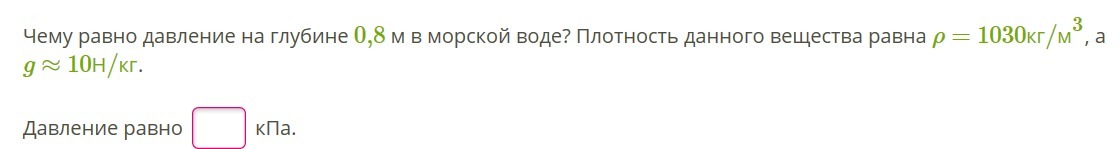 Запишем основную формулу p=ρgh. Всё известно, подставим числа: p=1030*10*0,8=824 Па, или 0,824 кПа.