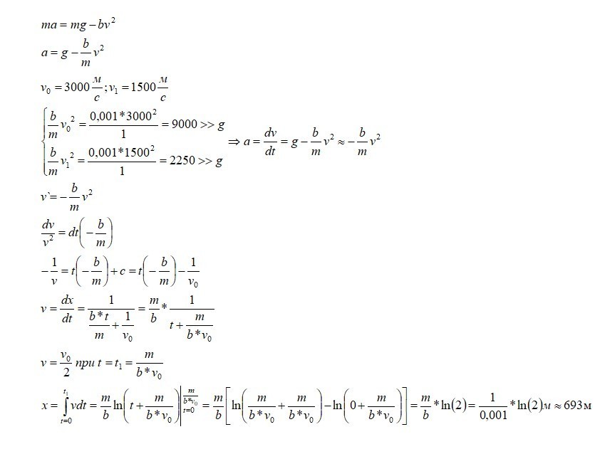 Метеорит массой 1 кг, влетевший в верхние слои атмосферы со скоростью V0 = 3 км/с, начинает испытывать силу сопротивления F = bV^2, где 0,001 кг/м. Какой путь пролетит метеорит в атмосфере к моменту «потери» половины скорости?РАСПИШИТЕ ПОПОДРОБНЕЕ ВСЁ РЕШЕНИЕ ЗАДАЧИ,ПОЖАЛУЙСТА)