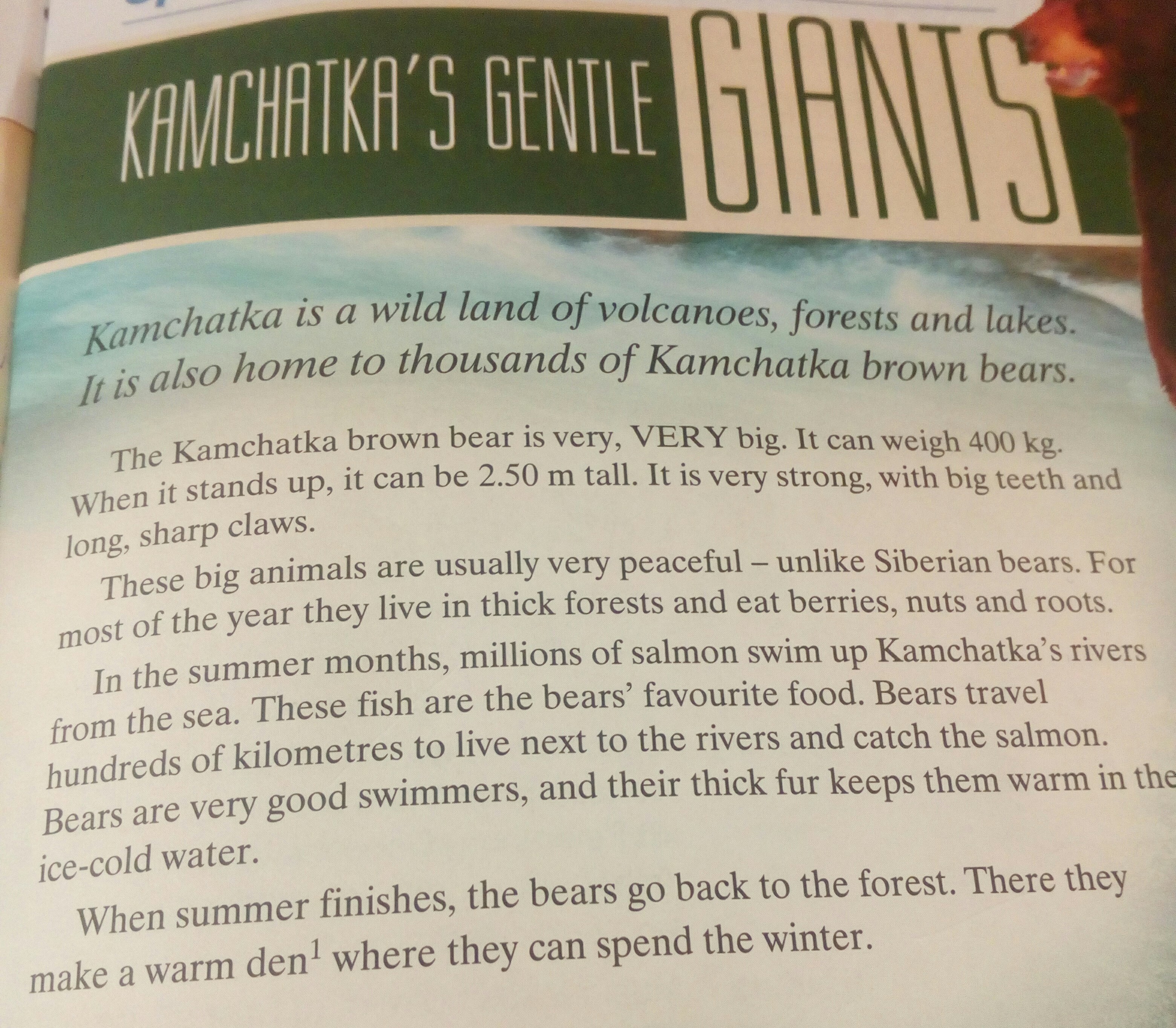 В летние месяцы, миллионы лососей заплывают в камчатские реки из моря. Эти рыба любимая еда медведей. Медведи проходят сотни километров для того, чтобы жить рядом с реками и ловить лососей. Медведи хорошие пловцы, и их густой мех позволяет им не замерзнуть в ледяной воде.