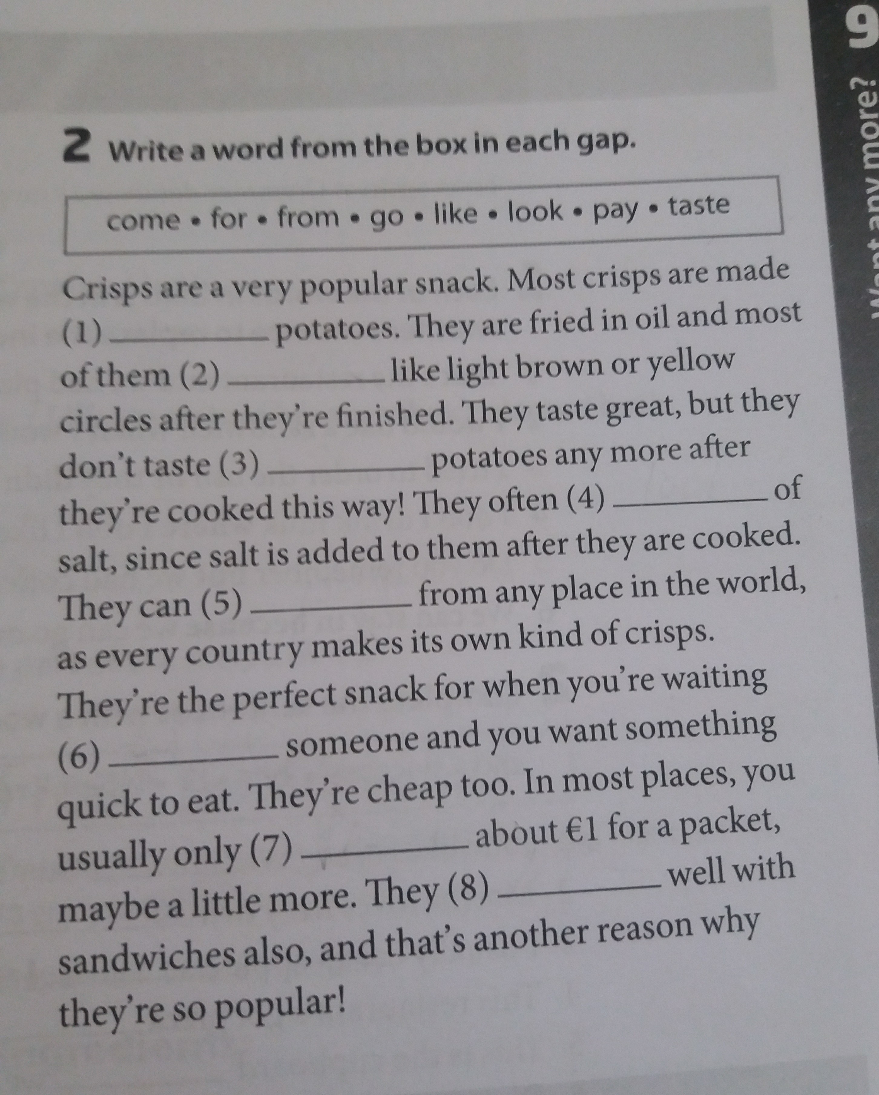 1. from, 2. look, 3. like, 4. taste, 5. come, 6. for, 7. pay, 8. go