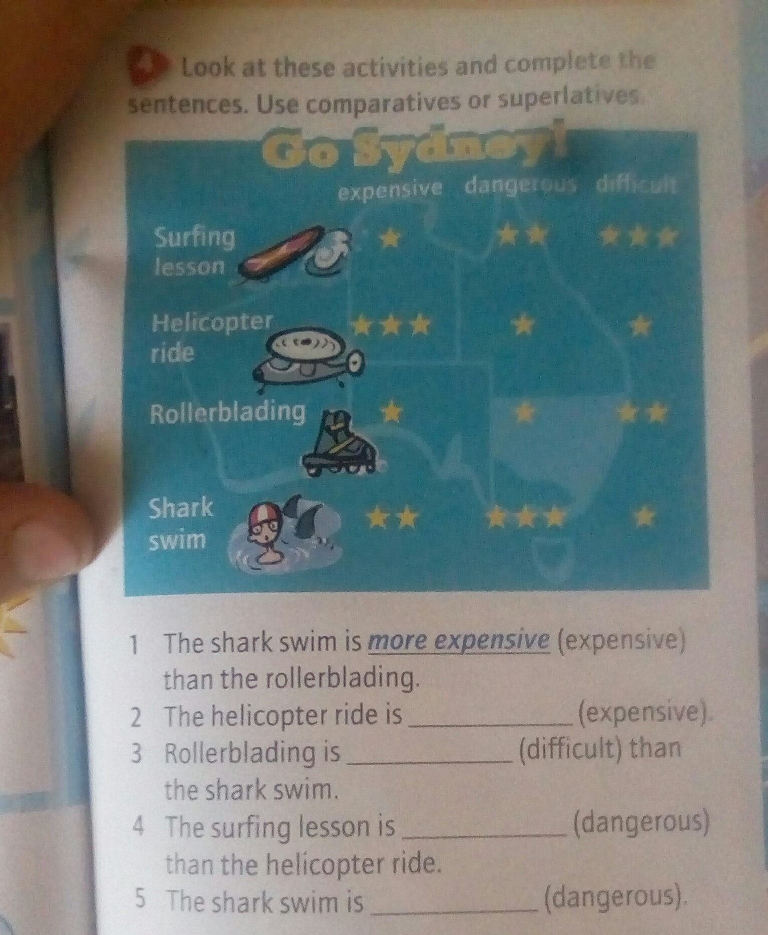 2. the most expensive, 3. more difficult, 4. more dangerous, 5. the most dangerous