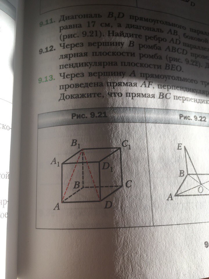 Диагональ B1D прямоугольного параллелепипеда ABCDA1B1C1D1 равна 17 см, а диагональ AB1 боковой грани AA1B1B равна 15 см. Найдите ребро AD, рисунок 9.21