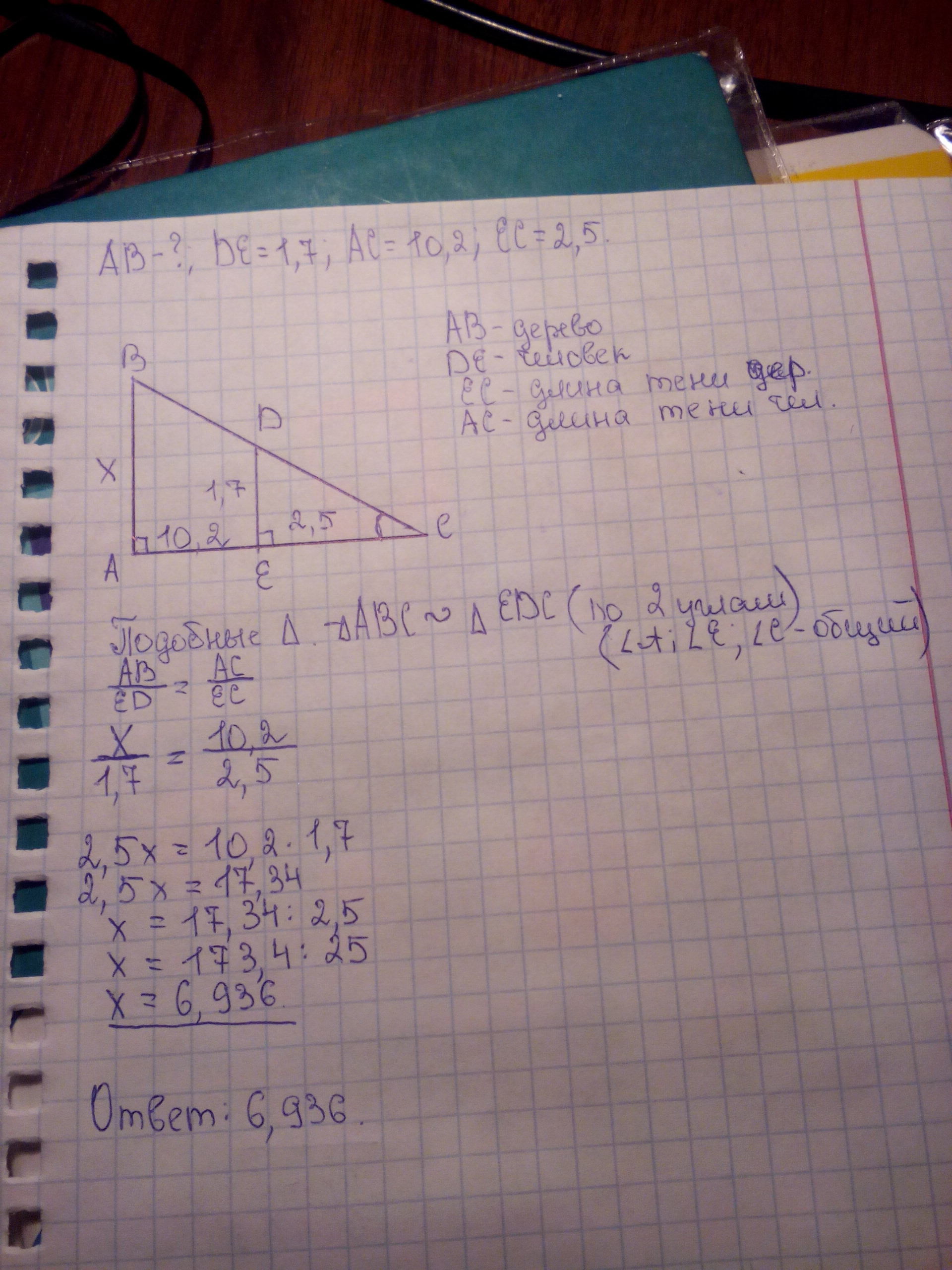 задача длина тени дерева равна 10,2м, а длина тени человека равна, рост которого 1,7м,равна 2,5м. Найти высоту дерева