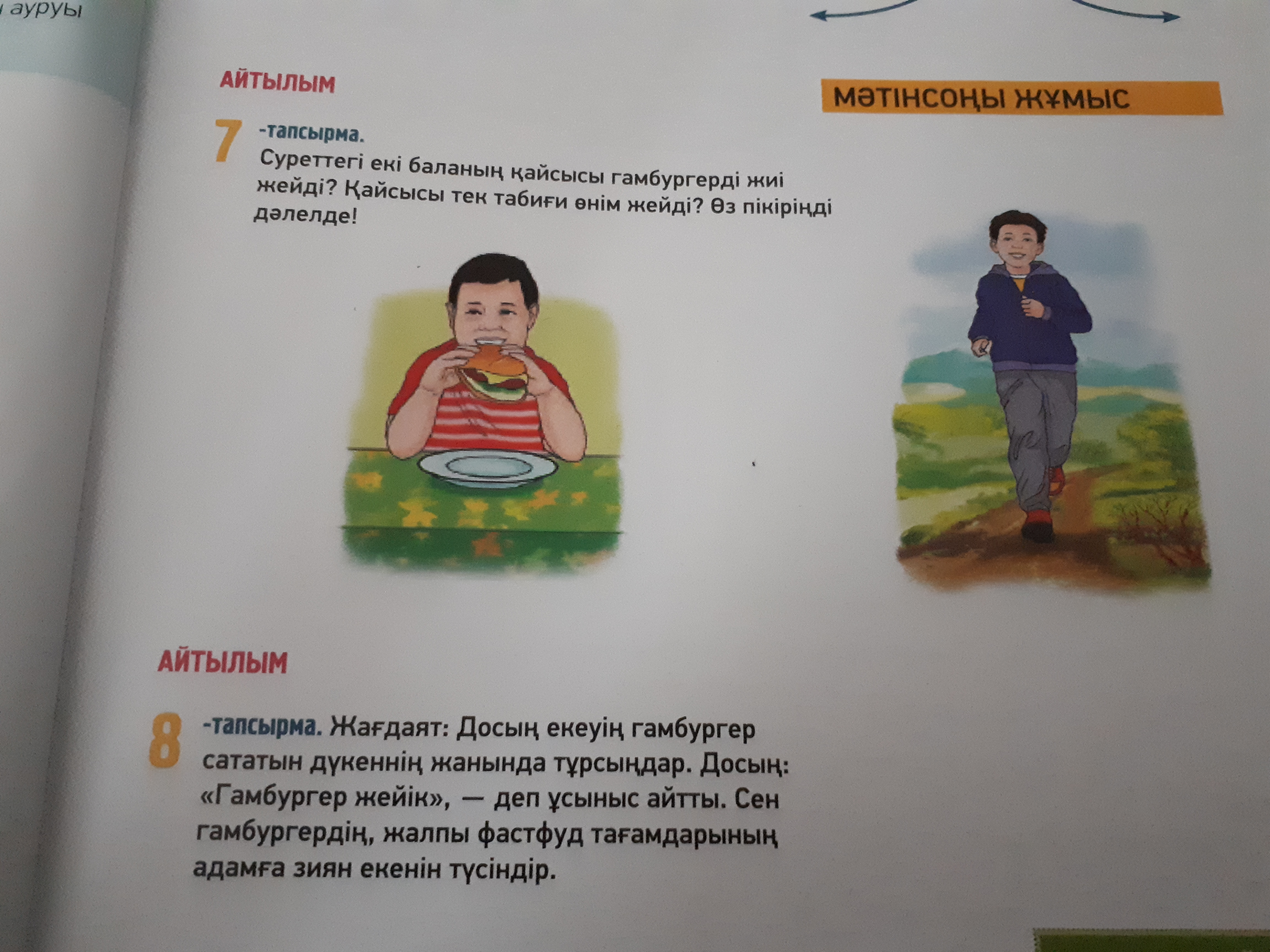 7 тапсырма 1 суреттегі бала гамбургер көп жейді. Ол адам ағзасына зиян. Ал 2 суреттегі бала спортпен шұғылданып, дәрумендер жейді. 2 суреттегі баланың ісі дұрыс