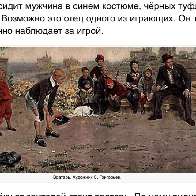 На среднем плане на лавке сидят зрители, явно увлеченные игрой, кроме собаки, которая думает о чем-то своем, скорее всего, о еде. На скамейке помимо детей сидит взрослый дядя, явно чрезвычайно увлеченный игрой. Наверное, он вспоминает себя в школьные годы. Рядом с дядей сидят две девочки. Первая – в плаще с капюшоном – тоже очень внимательно следит за игрой, второй также не менее интересно происходящее. Мне кажется, вторая девочка обязательная. На руках у нее маленький ребенок. Рядом с ней сидят два мальчика, явно заинтересованные игрой. Первый мальчик нагнулся, чтобы лучше видеть игру, а второй вытянул шею, потому что за дядей ему ничего не видно. За этим мальчиком стоит девочка. Мне кажется, что она хорошо учится. Она одета в школьную форму, на ее голове бант. Рядом – сидит мальчик с маленьким братом. Я считаю, что этот мальчик очень ответственный, все время помогает маме и заботится о младшем брате. Все зрители очень увлечены и сосредоточены на игре, даже младший брат последнего мальчика с интересом смотрит на происходящее. Возможно, что собака, лежащая рядом с братьями, им и принадлежит.