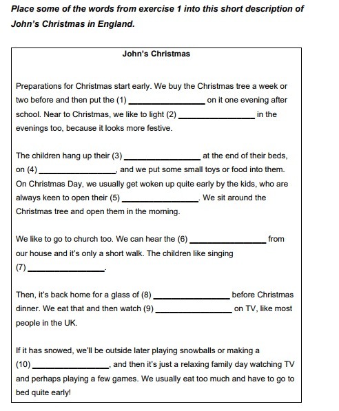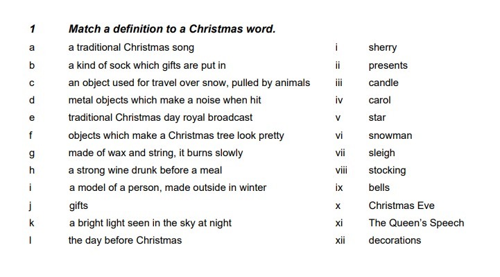 1. decorations, 2. candles, 3. stockings, 4.Christmas Eve , 5. presents, 6. traditional Christmas songs, 7. carols , 8. sherry, 9. The Queens Speech, 10. snowman