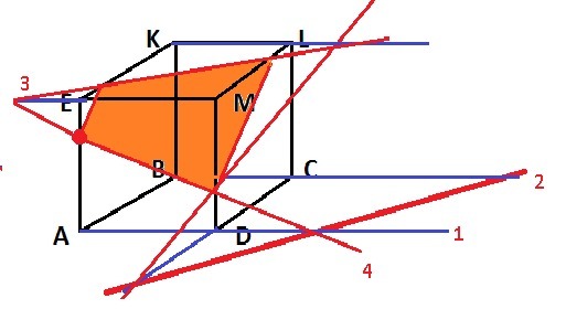 Помогите пожалуйста!! Построить сечение призмы куба в плоскости проходящей через прямую и точку не лежащей на этой прямой. Прямая не пересекает основания, точка лежит на любом боковом ребре.