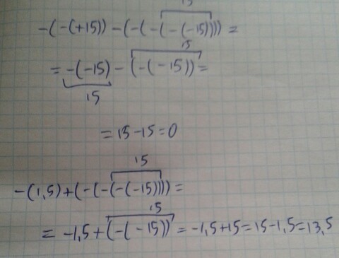 1)–(–(+15))–(–(–(–(–15))))=+(+15)+(–(–(–15)))= 15+(–(–(–15)))= 15–15= 0