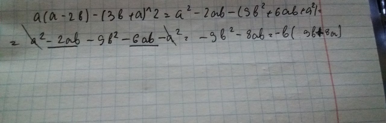 a^2-2ab-(9b^2+6ab+a^2)=a^2-2ab-9b^2-6ab-a^2= -9b^2-8ab= -b(9b+8a)