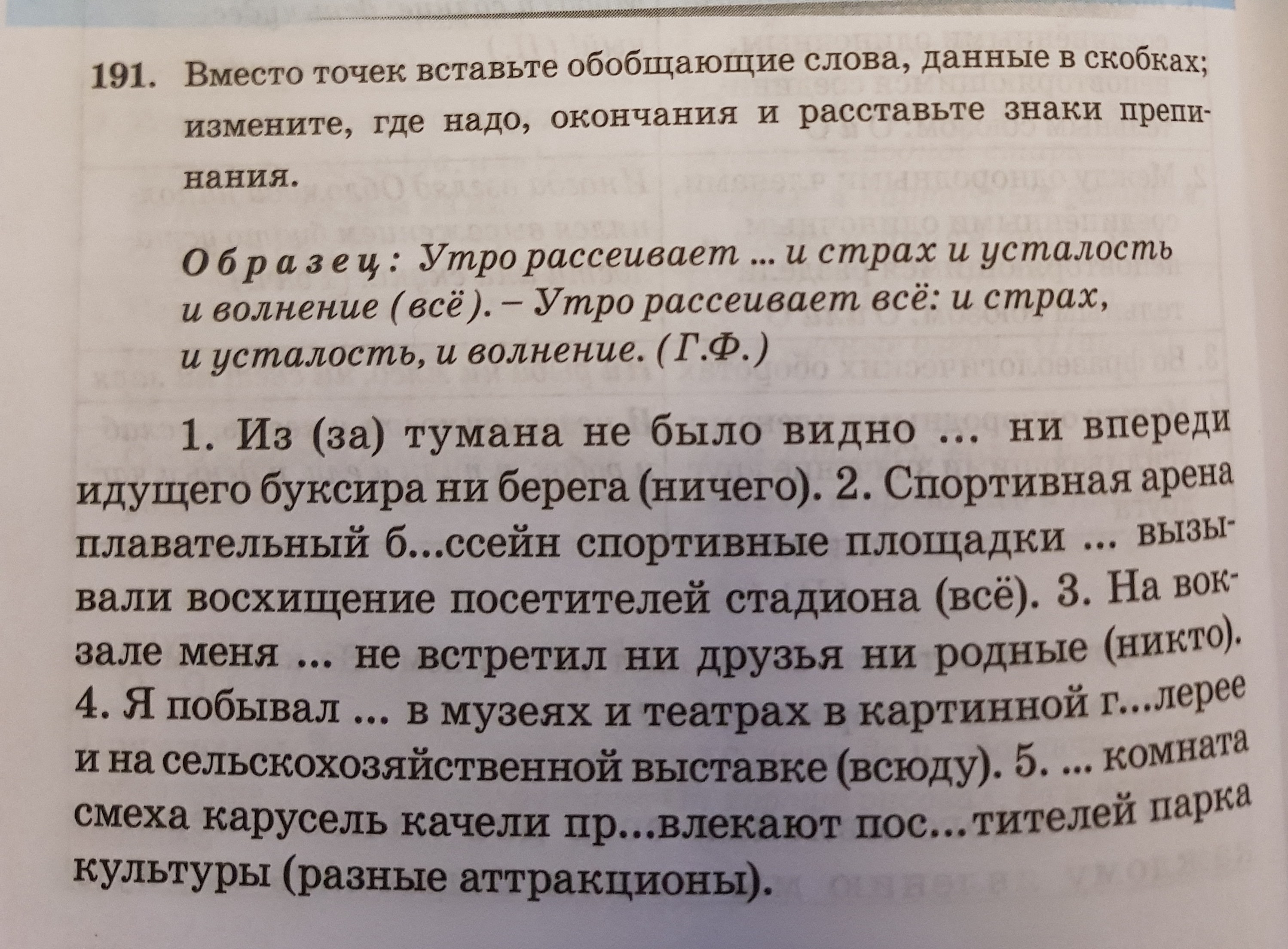 1. Из-за тумана не было видно ничего: ни впереди идущего буксира, ни берега. 2. Спортивная арена, плавательный бассейн-всё вызывало восхищение посетителей стадиона. 3. На вокзале меня никто не встретил: ни друзья, ни родные. 4. Я побывал всюду: в музеях и театрах, в картинной галерее и на сельскохозяйственной выставке. 5. Разные аттракционы: комната смеха, карусель, качели-привлекают посетителей парка культуры.