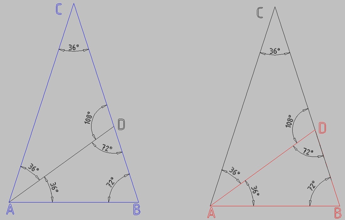 AB² = АС²+BC² - 2*AC*BC*cos(36°) = 2*АС²-2*АС²*1/4(1+√5) = AC²*(2-1/2-√5/2) = AC²*1/2*(3-√5)