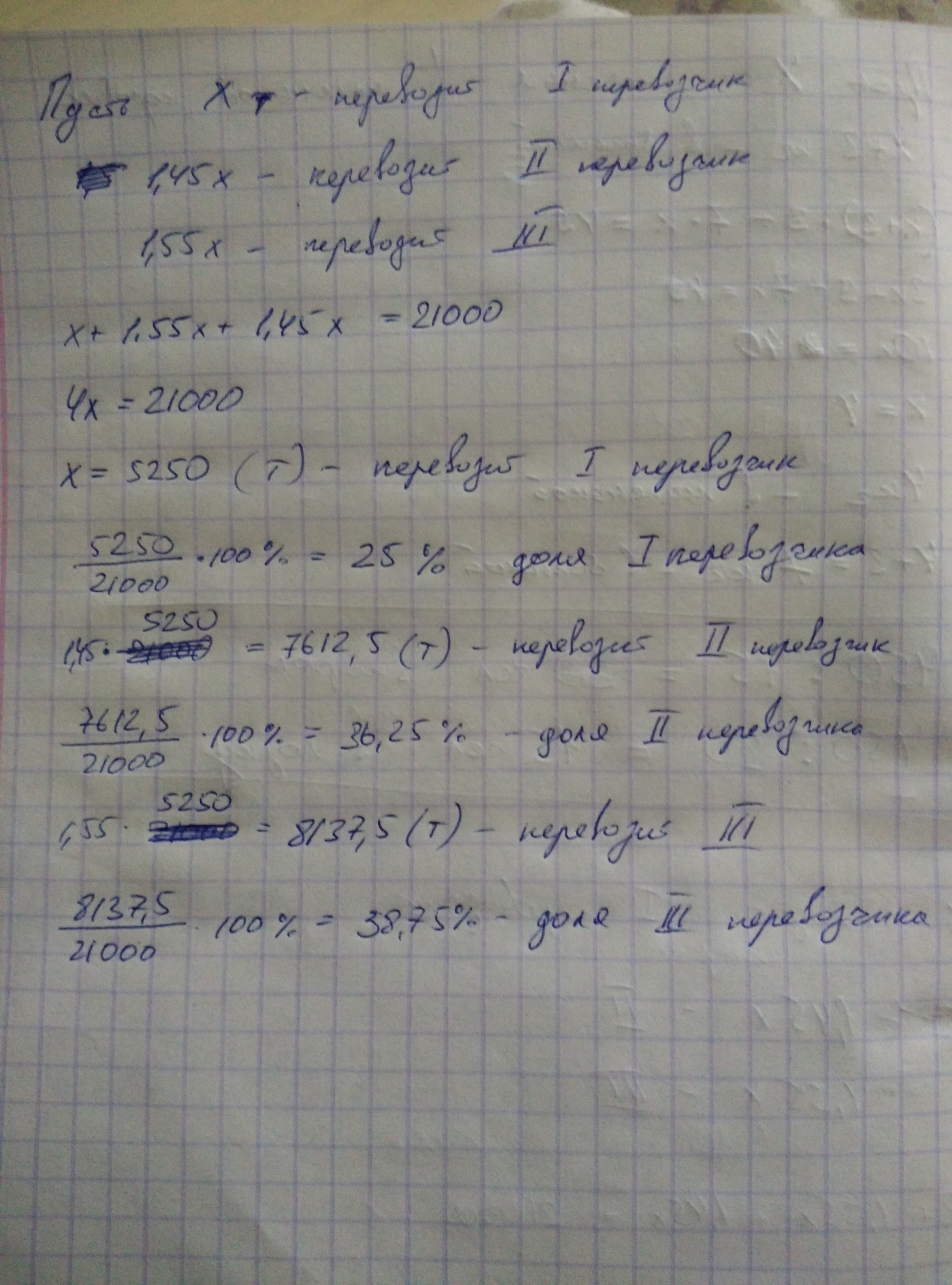 Три перевозчика должны перевезти груз объемом 21 000 тонн. Известно, что второй первозчик доставляет на 45% больше первого, а третий , в свою очередь, - на 55% больше первого. Какой объем груза из необходимого доставит каждый из перевозчиков.