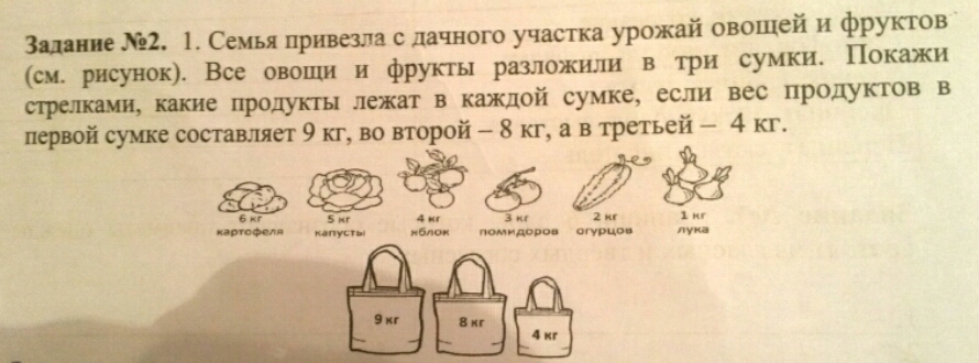 Семья привезла с дачного участка урожай овощей и фруктов. Все овощи и фрукты разложили в три сумки. Покажи стрелками, какие продукты лежат в каждой сумке, если вес продуктов в первой сумке составляет 9 кг, во второй-8кг, в третьей- 4кг.