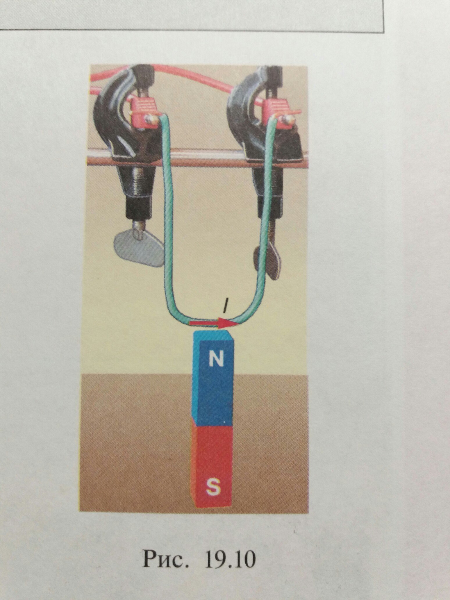 На рисунке представлена схема опыта по обнаружению действия магнитного поля на проводник с током. Как направлена сила Ампера в этом опыте?