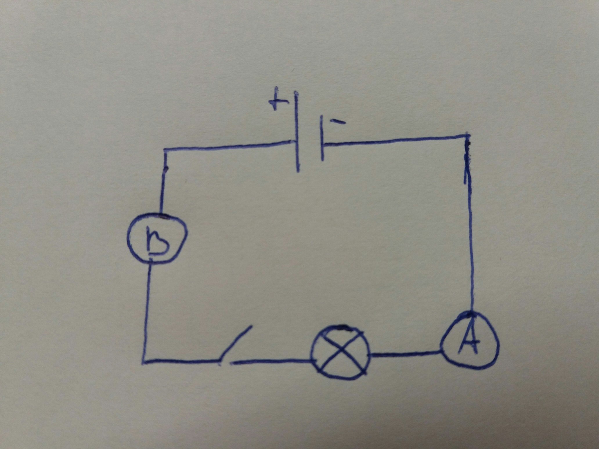 Начерти схему цепи, состоящей из аккамулятора, лампы, ключа, амперметра и вольтметра, для случая, когда вольтметром измеряют напряжение на полюсах источника тока.