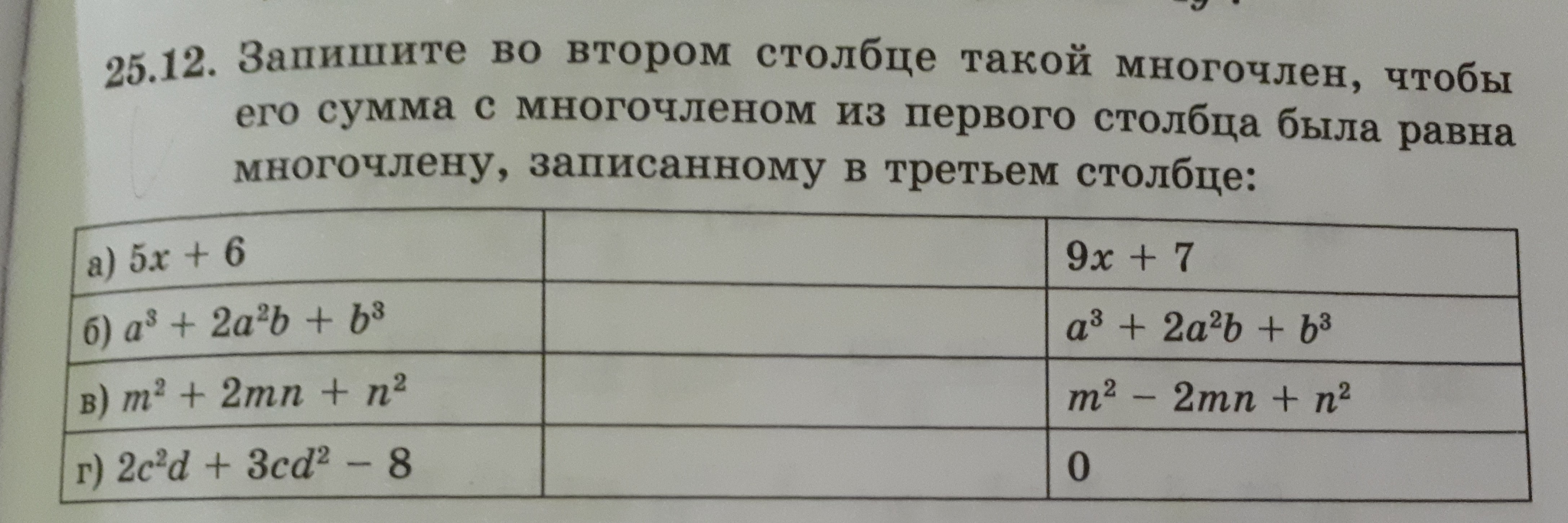 Запишите во втором столбце такой многочлен, чтобы его сумма с многочленом из первого столбца была равна многочлену, записанную в третьем столбце.