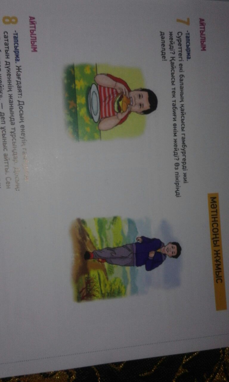 Сүреттегі бірінші бала гамбургерді жиі жейді,ал екінші бала тек табиғи өнім жейді