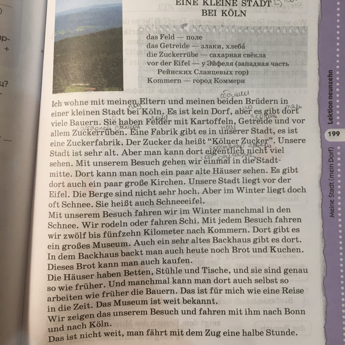Я живу с моими родителями и обоими братьями в маленьком городе возле Кельна. Это не деревня, но есть там много крестьян . Они имеют поля с картофелем, хлебами и прежде всего сахарной свеклой. В городе есть один завод, это сахарный завод. Сахар тут зовется "Кельнский сахар".Наш город очень старый. Но на самом деле можно там не много увидеть. С нашим гостем идем мы однажды в центр города. Тут можно еще пару старых домов увидеть. Есть там также пара больших церквей. Наш город расположен у Эйфеля. Горы не очень высокие. Но зимой лежит тут все таки часто снег. Он(город) называется также снежный Эйфель.