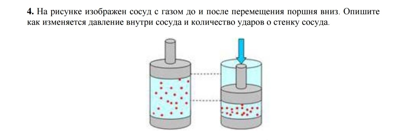 4. На рисунке изображен сосуд с газом до и после перемещения поршня вниз. Опишите