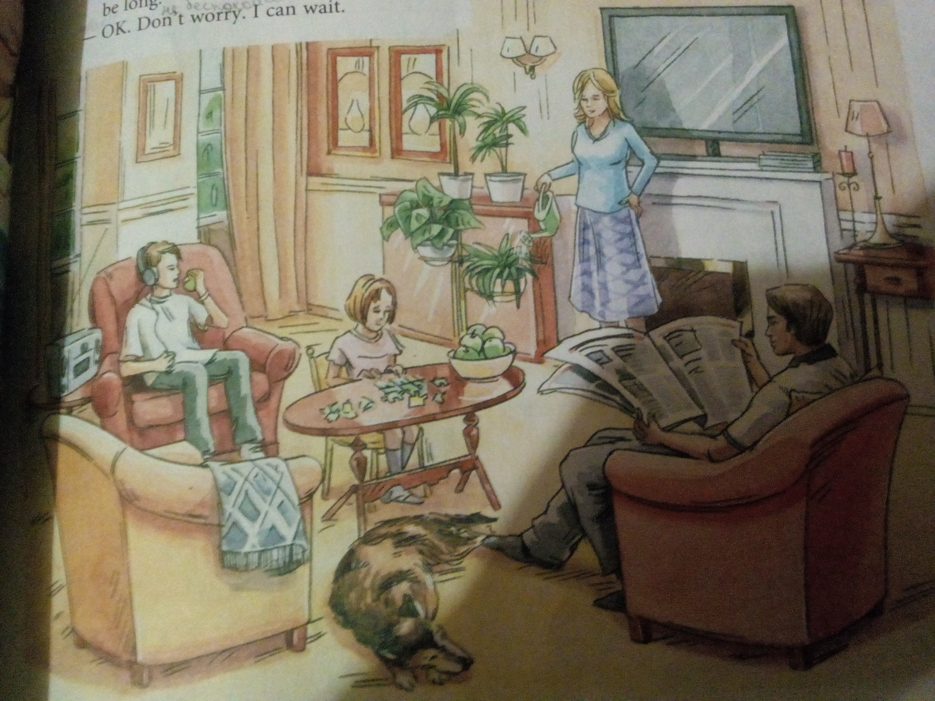 The mum do housework , father read newspaper , brother listen to music and eat buiskweet . Small sister do puzzle.