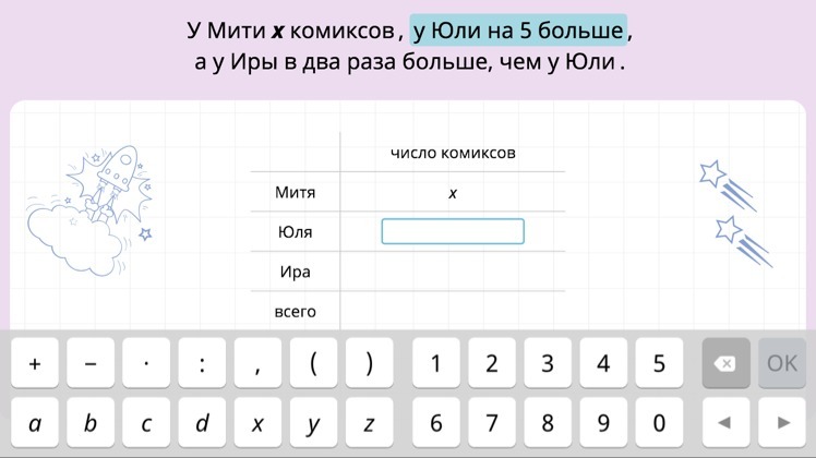 У Юли ×+5 у иры (×+5)*2 всего 4×+15