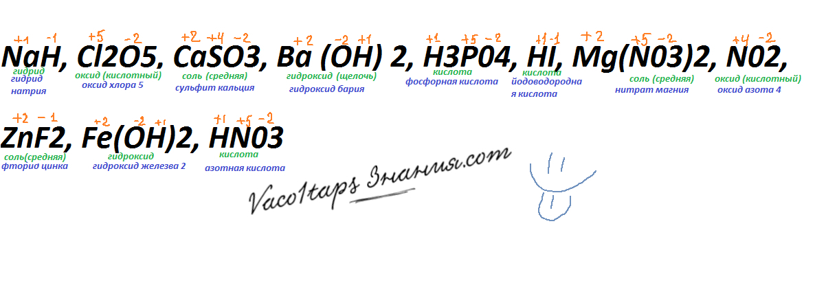 Распределите соединения NaH, Сl2О5, CaSО3, Ва (ОН) 2, H3P04, HI, Mg(N03)2, N02, ZnF2, Fe(OH)2, HN03пoклассам; укажите названия; определите с. о. в предложенных соединениях.