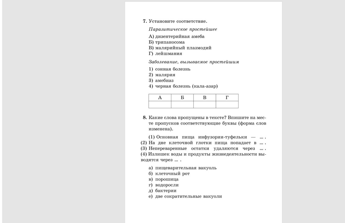 1 -д) бактерии, 2. - б) клеточный рот. 3.-в) порошица. 4.- е) две сократительные вакуоли