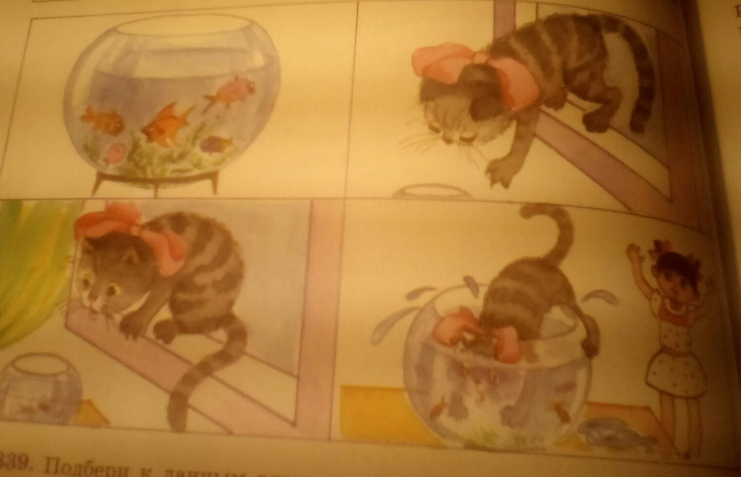 В комнате стоял аквариум с рыбками. Рыбки плавали в воде. Но вот к аквариуму подошёл кот. Ему было интересно кто же там плавает. Кот подходил всё ближе и ближе.и вот он заметил вкусных рыбок. Кот прыгнул в аквариум и стал ловить рыб. Но вот дверь в комнату открылась и девочка вошла в комнату. Она увидела как кот ловил рыбок и очень испугалась.