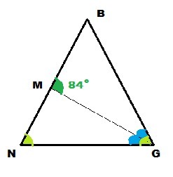 В равнобедренном треугольнике NBG проведена биссектриса GM угла ∠G у основания NG, ∠GMB = 84 градуса. Определите величины углов данного треугольника.